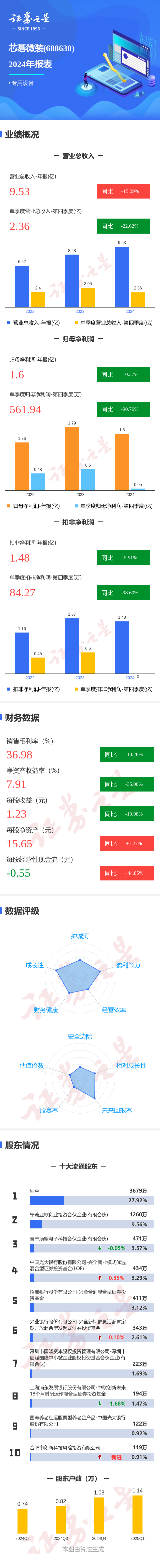 证券之星消息,芯碁微装2024年年报显示,公司主营收入9.54亿元,同比上升15.09%;归母净利润1.61亿元,同比下降10.38%;扣非净利润1.49亿元,同比下降5.92%;其中2024年第四季度,公司单季度主营收入2.36亿元,同比下降22.62%;单季度归母净利润561.94万元,同比下降90.77%;单季度扣非净利润84.28万元,同比下降98.61%;负债率26.04%,投资收益418.48万元,财务费用-1767.67万元,毛利率36.98%。